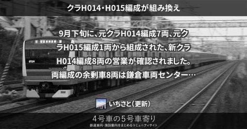 E233系 クラH014・H015編成が組み換え 9月下旬に、元クラH014編成7両、元クラH015編成1両から組成された、新クラH014編成8両の営業が確認されました。 両編成の余剰車8両は鎌倉車両センターに留置されています。 2018/09/30 いちさと E233系