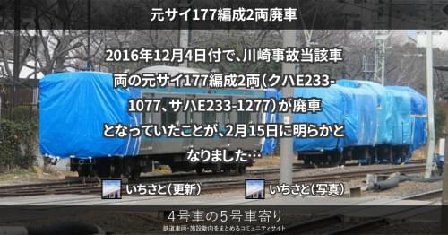 E233系 元サイ177編成2両廃車 2016年12月4日付で、川崎事故当該車両の元サイ177編成2両(クハE233-1077、サハE233-1277)が廃車となっていたことが、2月15日に明らかとなりました。 事故当時のウラ177編成で、E233系では初めての廃車となります。 2017/02/15 いちさと E233系
