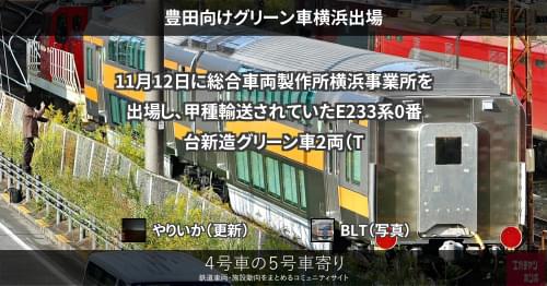 11月12日に総合車両製作所横浜事業所を出場し、甲種輸送されていたE233系0番台新造グリーン車2両(TsdTsd'57)が、13日に豊田へ到着しました。