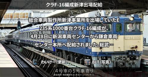E235系 クラF-16編成新津出場配給 総合車両製作所新津事業所を出場していたE235系1000番台クラF-16編成が、4月28日に新潟車両センターから鎌倉車両センター本所へ配給されました。 総武快速・横須賀線向け1000番台の基本編成16本目です。 2022/04/28 わいけー E235系