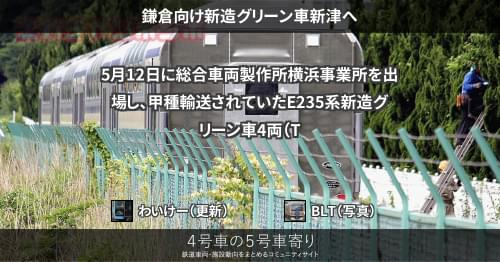 E235系 鎌倉向け新造グリーン車新津へ 5月12日に総合車両製作所横浜事業所を出場し、甲種輸送されていたE235系新造グリーン車4両(TsdTsd’1017~1018)が、13日に新津へ到着しました。 2022/05/13 わいけー E235系