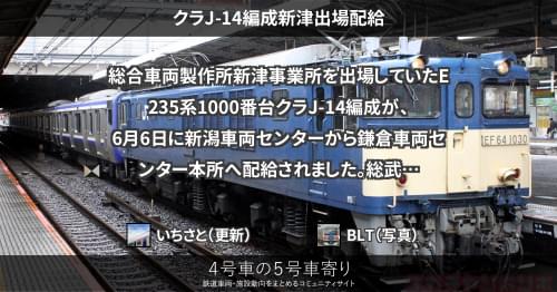 E235系 クラJ-14編成新津出場配給 総合車両製作所新津事業所を出場していたE235系1000番台クラJ-14編成が、6月6日に新潟車両センターから鎌倉車両センター本所へ配給されました。 総武快速・横須賀線向け1000番台の付属編成14本目です。 2022/06/06 いちさと E235系