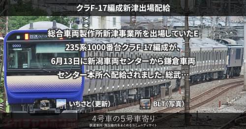 E235系 クラF-17編成新津出場配給 総合車両製作所新津事業所を出場していたE235系1000番台クラF-17編成が、6月13日に新潟車両センターから鎌倉車両センター本所へ配給されました。 総武快速・横須賀線向け1000番台の基本編成17本目です。 2022/06/13 いちさと E235系