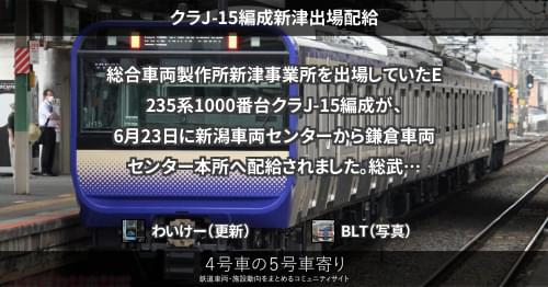 E235系 クラJ-15編成新津出場配給 総合車両製作所新津事業所を出場していたE235系1000番台クラJ-15編成が、6月23日に新潟車両センターから鎌倉車両センター本所へ配給されました。 総武快速・横須賀線向け1000番台の付属編成15本目です。 2022/06/23 わいけー E235系