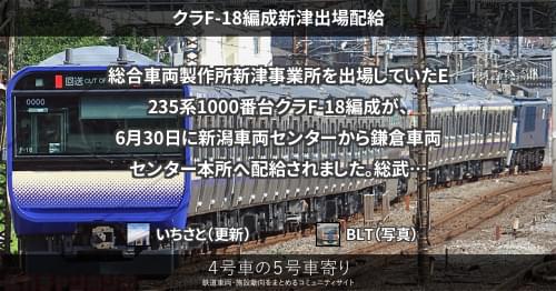 E235系 クラF-18編成新津出場配給 総合車両製作所新津事業所を出場していたE235系1000番台クラF-18編成が、6月30日に新潟車両センターから鎌倉車両センター本所へ配給されました。 総武快速・横須賀線向け1000番台の基本編成18本目です。 2022/06/30 いちさと E235系