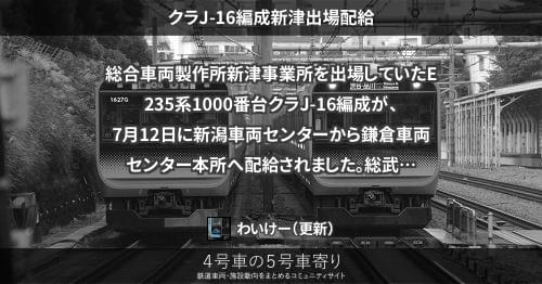 E235系 クラJ-16編成新津出場配給 総合車両製作所新津事業所を出場していたE235系1000番台クラJ-16編成が、7月12日に新潟車両センターから鎌倉車両センター本所へ配給されました。 総武快速・横須賀線向け1000番台の付属編成16本目です。 2022/07/12 わいけー E235系