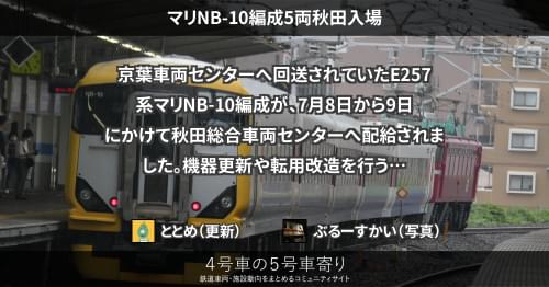 E257系 マリNB-10編成5両秋田入場 京葉車両センターへ回送されていたE257系マリNB-10編成が、7月8日から9日にかけて秋田総合車両センターへ配給されました。 機器更新や転用改造を行う可能性があります。 2021/07/09 ととめ E257系