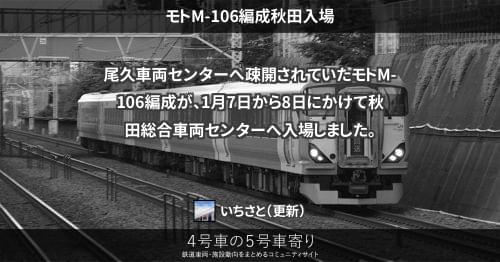 E257系 モトM-106編成尾久へ 1月5日、モトM-106編成が尾久車両センターへ疎開されました。波動運用に復帰しましたが、再び疎開されました。 2020/01/05 2020/01/07 いちさと E257系