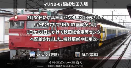 E257系 マリNB-07編成秋田入場 3月30日に京葉車両センターへ回送されていたE257系マリNB-07編成が、4月1日から2日にかけて秋田総合車両センターへ配給されました。 機器更新や転用改造を行う可能性があります。 2020/04/02 いちさと E257系