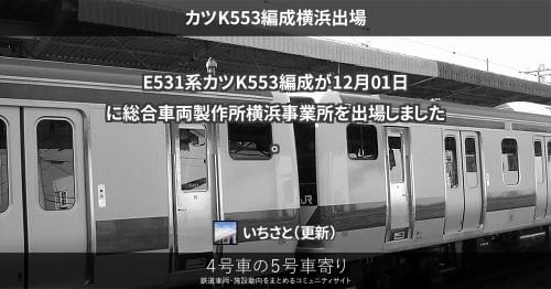 E531系 カツK551編成横浜出場 E531系3000番台カツK551編成が10月15日に総合車両製作所横浜事業所を出場しました。 同編成は車体風道、スノープロウなどを採用し、耐雪構造が強化されており、今後の輸送施策を踏まえた寒冷地仕様車と思われます。 2015/10/15 いちさと E531系
