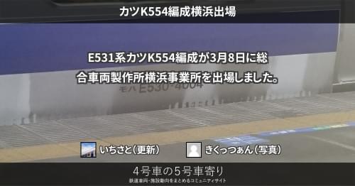 E531系 カツK555編成新津出場 総合車両製作所新津事業所を出場していたE531系カツK555編成が、3月6日に新潟車両センターから尾久車両センターへ配給されました。 新津でのE531系3000番台の新製は初めてです。 2017/03/06 いちさと E531系