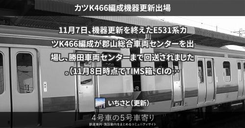 E531系 カツK466編成機器更新出場 11月7日、機器更新を終えたE531系カツK466編成が郡山総合車両センターを出場し、勝田車両センターまで回送されました。 (11月8日時点でTIMS箱、CIの状況が未確認です。) 2022/11/07 2022/11/08 いちさと E531系