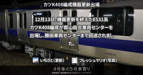 E531系 カツK408編成機器更新出場 12月13日、機器更新を終えたE531系カツK408編成が郡山総合車両センターを出場し、勝田車両センターまで回送されました。 https://4gousya.net/forums/post/%E3%82%AB%E3%83%84k408%E7%B7%A8%E6%88%90%E3%81%8C%E6%A9%9F%E5%99%A8%E6%9B%B4%E6%96%B0 2022/12/14 いちさと E531系