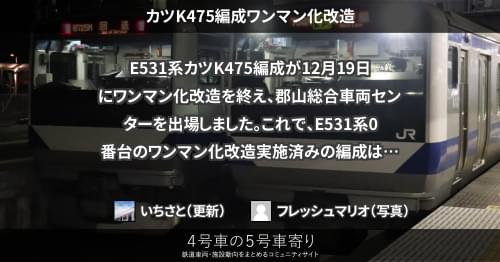 E531系 カツK475編成ワンマン化改造 E531系カツK475編成が12月19日にワンマン化改造を終え、郡山総合車両センターを出場しました。 これで、E531系0番台のワンマン化改造実施済みの編成は23本目となります。 2022/12/20 いちさと E531系