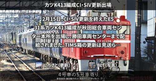 E531系 カツK413編成CI・SIV更新出場 2月15日、CI・SIV更新を終えたE531系カツK413編成が秋田総合車両センター本所を出場し、勝田車両センターまで配給されました。 TIMS箱の更新は見送られています。 2023/02/15 2023/02/16 いちさと E531系