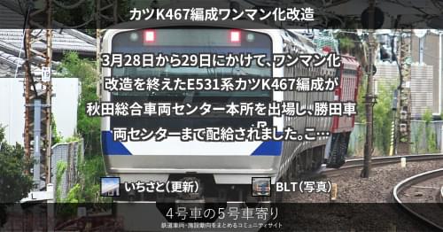 E531系 カツK467編成ワンマン化改造 3月28日から29日にかけて、ワンマン化改造を終えたE531系カツK467編成が秋田総合車両センター本所を出場し、勝田車両センターまで配給されました。 これで、E531系0番台のワンマン化改造実施済みの編成は17本目となります。 2022/03/29 2022/03/30 いちさと E531系