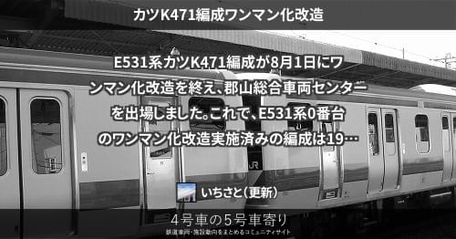 E531系 カツK471編成ワンマン化改造 E531系カツK471編成が8月1日にワンマン化改造を終え、郡山総合車両センターを出場しました。 これで、E531系0番台のワンマン化改造実施済みの編成は19本目となります。 2022/08/01 いちさと E531系