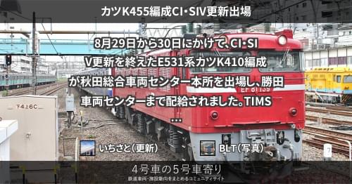 E531系 カツK455編成CI・SIV更新出場 8月29日から30日にかけて、CI・SIV更新を終えたE531系カツK410編成が秋田総合車両センター本所を出場し、勝田車両センターまで配給されました。 TIMS箱の更新は見送られています。 2022/08/30 いちさと E531系