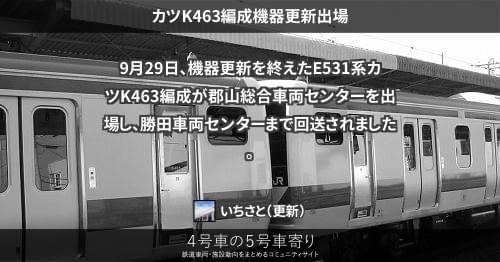 E531系 カツK463編成機器更新出場 9月29日、機器更新を終えたE531系カツK463編成が郡山総合車両センターを出場し、勝田車両センターまで回送されました。 2022/09/29 2022/10/03 いちさと E531系