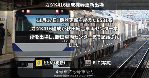 E531系 カツK416編成機器更新出場 11月17日、機器更新を終えたE531系カツK416編成が秋田総合車両センター本所を出場し、勝田車両センターまで配給されました。 2021/11/17 ととめ E531系