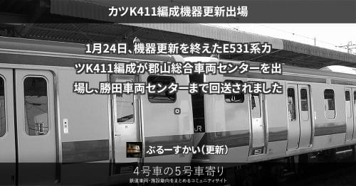 E531系 カツK411編成機器更新出場 1月24日、機器更新を終えたE531系カツK411編成が郡山総合車両センターを出場し、勝田車両センターまで回送されました。 2022/01/24 ぶるーすかい E531系