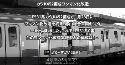 E531系 カツK452編成ワンマン化改造 E531系カツK452編成が1月28日にワンマン化改造を終え、郡山総合車両センターを出場しました。 これで、E531系0番台のワンマン化改造実施済みの編成は15本目となります。 2022/01/28 ぶるーすかい E531系