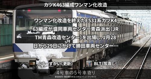 E531系 カツK463編成ワンマン化改造 ワンマン化改造を終えたE531系カツK463編成が盛岡車両センター青森派出(JRTM青森改造センター)を出場し、1月28日から29日にかけて勝田車両センターまで配給されました。 これで、E531系0番台のワンマン化改造実施済みの編成は16本目です。 2022/01/29 ぶるーすかい E531系