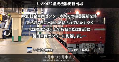 E531系 カツK422編成機器更新出場 秋田総合車両センター本所での機器更新を終え、3月7日に出場し配給されていたカツK422編成が3月上旬(7日または8日)に勝田車両センターに到着しました。 2022/03/08 いちさと E531系