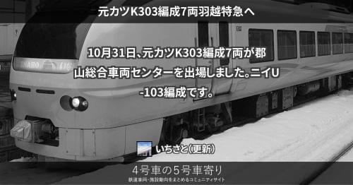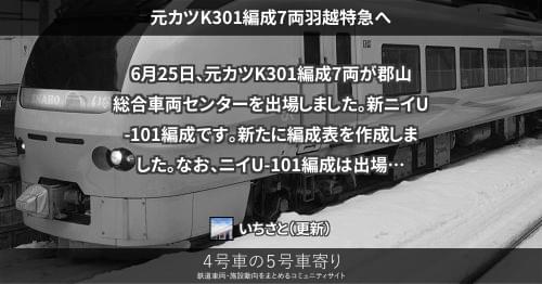 E653系 元カツK301編成7両羽越特急へ 6月25日、元カツK301編成7両が郡山総合車両センターを出場しました。新ニイU-101編成です。 新たに編成表を作成しました。なお、ニイU-101編成は出場当日には新潟へ行かず、勝田へ向かいました。 2013/06/25 いちさと E653系常磐特急