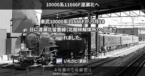 東武 10000系11666F渡瀬北へ 東武10000系11666Fが、3月14日に渡瀬北留置線(北館林解体所)へ回送されました。 https://4gousya.net/forums/post/%e6%9d%b1%e6%ad%a611666f%e3%81%8c%e5%8c%97%e9%a4%a8%e6%9e%97%e3%81%b8%e8%87%a8%e6%99%82%e5%9b%9e%e9%80%81 2023/03/14 2023/07/02 いちさと 東武