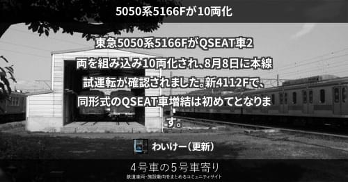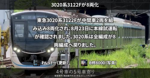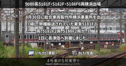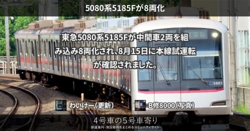 東急5080系5181Fが中間車2両を組み込み8両化され、10月4日に本線試運転が確認されました。