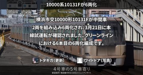 横浜市交10000形10021Fが中間車2両を組み込み6両化され、3月27日に本線試運転が確認されました。