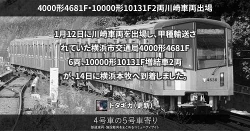 3月8日に川崎車両を出場し、甲種輸送されていた横浜市交4000形4691F6両が、10日に横浜本牧へ到着しました。