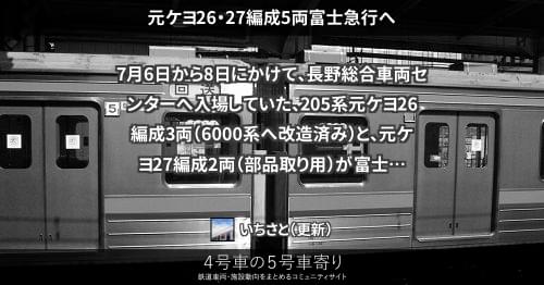 205系(東) 元ケヨ26・27編成5両富士急行へ 7月6日から8日にかけて、長野総合車両センターへ入場していた、205系元ケヨ26編成3両(6000系へ改造済み)と、元ケヨ27編成2両(部品取り用)が富士急行へ甲種輸送されました。 2012/07/09 いちさと 205系(東)