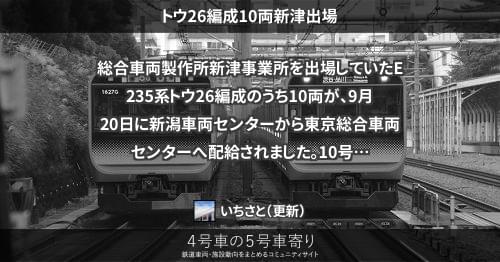 E235系 トウ26編成10両新津出場 総合車両製作所新津事業所を出場していたE235系トウ26編成のうち10両が、9月20日に新潟車両センターから東京総合車両センターへ配給されました。 10号車へはサハE235-4622を組み込むでしょう。 2018/09/20 いちさと E235系