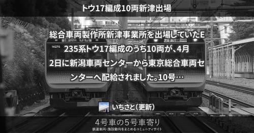 E235系 トウ17編成10両新津出場 総合車両製作所新津事業所を出場していたE235系トウ17編成のうち10両が、4月2日に新潟車両センターから東京総合車両センターへ配給されました。 10号車へはサハE235-4619を組み込むでしょう。 2018/04/02 いちさと E235系