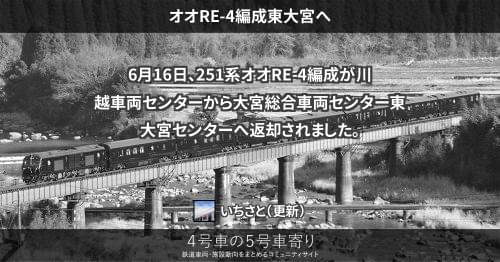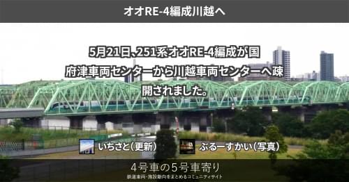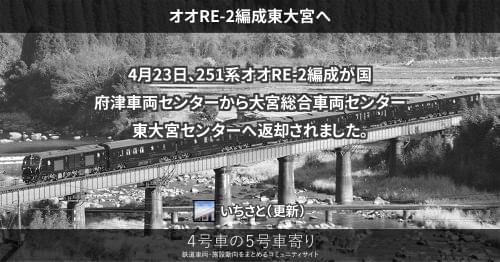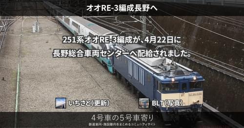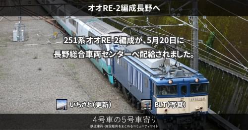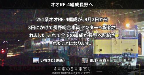 251系 オオRE-4編成長野へ 251系オオRE-4編成が、9月2日から3日にかけて長野総合車両センターへ配給されました。 これで全ての編成が長野へ配給されたことになります。 2020/09/03 いちさと 251系