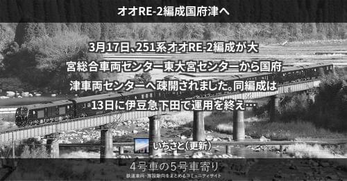 251系 オオRE-2編成国府津へ 3月17日、251系オオRE-2編成が大宮総合車両センター東大宮センターから国府津車両センターへ疎開されました。 同編成は13日に伊豆急下田で運用を終えてから国府津車両センターへ留置され、17日に返却されていました。 2020/03/17 2020/03/18 いちさと 251系