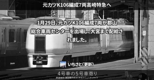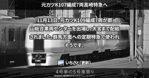 651系 元カツK107編成7両高崎特急へ 11月13日、元カツK109編成7両が郡山総合車両センターを出場し、大宮まで配給されました。群馬方面への定期特急で使われそうです。 2013/11/13 いちさと 651系常磐特急