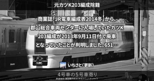 651系 元カツK203編成除籍 商業誌「JR電車編成表2014冬」から、郡山総合車両センターに入場していたカツK203編成が2013年9月11日付で廃車となっていたことが判明しました。651系初の廃車となります。 2013/11/16 いちさと 651系常磐特急
