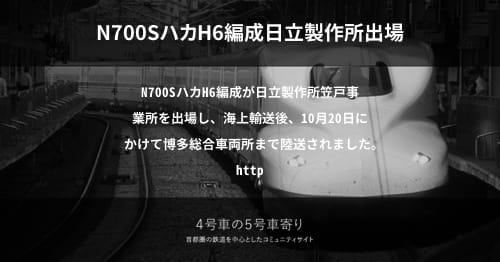 N700SハカH6編成が日立製作所笠戸事業所を出場し、海上輸送後、10月20日にかけて博多総合車両所まで陸送されました。
