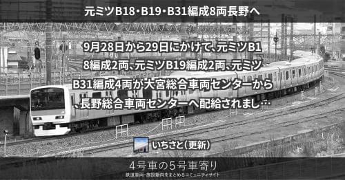 E231系 元ミツB18・B19・B31編成8両長野へ 9月28日から29日にかけて、元ミツB18編成2両、元ミツB19編成2両、元ミツB31編成4両が大宮総合車両センターから、長野総合車両センターへ配給されました。 元ミツB18、B19編成は武蔵野線転用に伴う余剰車で、元ミツB31編成は伴走車です。 2018/09/29 いちさと E231系