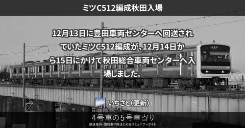 209系 ミツC512編成秋田入場 12月13日に豊田車両センターへ回送されていたミツC512編成が、12月14日から15日にかけて秋田総合車両センターへ入場しました。 2018/12/15 いちさと 209系