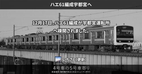 209系 元ハエ62編成2両東大宮へ 郡山総合車両センターへ入場していた209系元ハエ62編成2両(廃車済み)が、12月25日から26日にかけて、東京・大宮総合訓練センター(東大宮)へ甲種輸送されました。機器更新済みの東大宮訓練機械になります。 新たに「山手線・中央総武緩行線の世代交代」へ「訓練機械の増備と機器更新」を追加しました。 2018/12/26 いちさと 209系