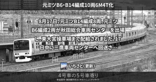 E231系 元ミツB6・B14編成10両6M4T化 8月17日、元ミツB14編成8両、元ミツB6編成2両が秋田総合車両センターを出場し、東大宮操車場まで配給されました。17日中に三鷹車両センターへ回送されています。 同編成は6M4T化、機器更新、FD対応改造などを受け、中央総武緩行線へ残留するでしょう。 2018/08/17 2018/08/18 いちさと E231系