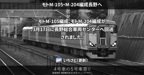 E257系 モトM-105・M-204編成長野へ モトM-105編成、モトM-204編成が、3月17日に長野総合車両センターへ回送されました。 2019/03/17 2019/03/24 いちさと E257系