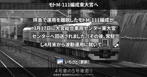 E257系 モトM-111編成東大宮へ 拝島で運用を離脱したモトM-111編成が、3月17日に大宮総合車両センター東大宮センターへ回送されました。(その後、常駐し4月末から波動運用に就いています。) 2019/03/17 2019/05/12 いちさと E257系