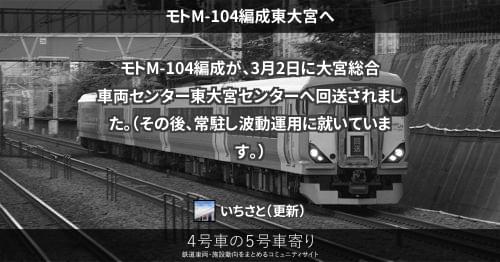 E257系 モトM-104編成東大宮へ モトM-104編成が、3月2日に大宮総合車両センター東大宮センターへ回送されました。(その後、常駐し波動運用に就いています。) 2019/03/02 2019/03/24 いちさと E257系