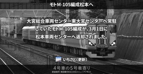 E257系 モトM-105編成松本へ 大宮総合車両センター東大宮センターへ常駐していたモトM-105編成が、3月1日に松本車両センターへ返却されました。 2019/03/01 2019/03/24 いちさと E257系