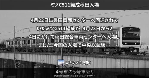 209系 ミツC511編成秋田入場 4月22日に豊田車両センターへ回送されていたミツC511編成が、4月23日から24日にかけて秋田総合車両センターへ入場しました。 今回の入場で中央総武緩行線用の209系は消滅しました。 2019/04/24 いちさと 209系